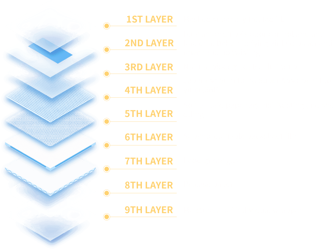Super dry and breathable treated perforated PE surface, and special designed back sheet, all makes the pad with fantastic breathability, no extra moisture.