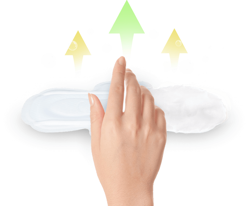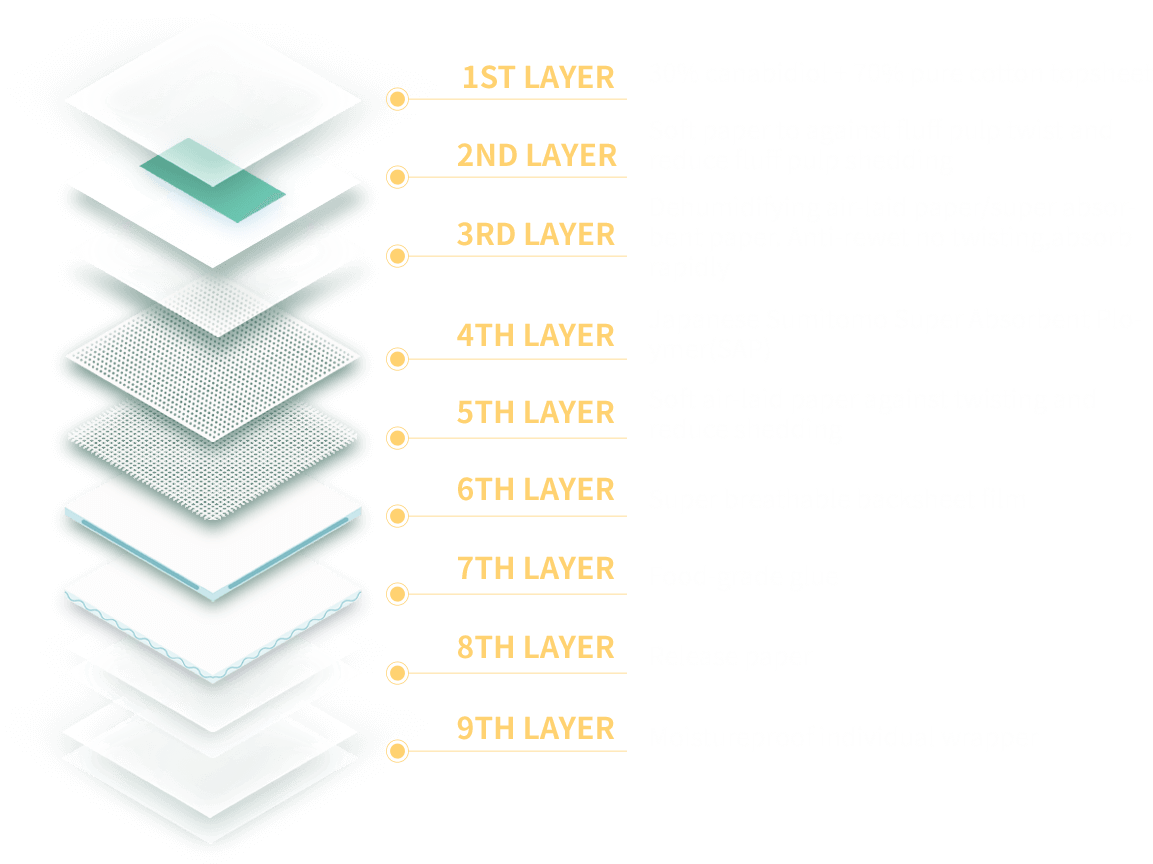 Pure cotton and cannabidiol surface layer with delicate touch super soft and breathable. It absorbs quickly the backflow, reducing the contact time of liquid and skin, no friction.